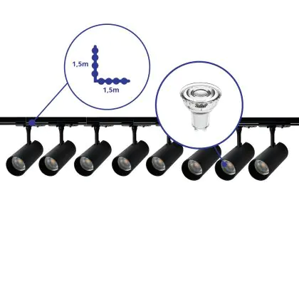 Complete Set 1-Phase Rail L 1,5 x 1,5 Meter Black | incl. 8x Spot + GU10 2700K 3W Dimmable + End Cap, Power Connector and L -Connector