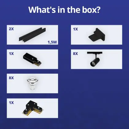 Manufacturer Name | Complete L shaped 1-Phase Track Set Black incl. 8x Spot fixture + GU10 2700K 3W Dim – 1,5 x 1,5 mete | |